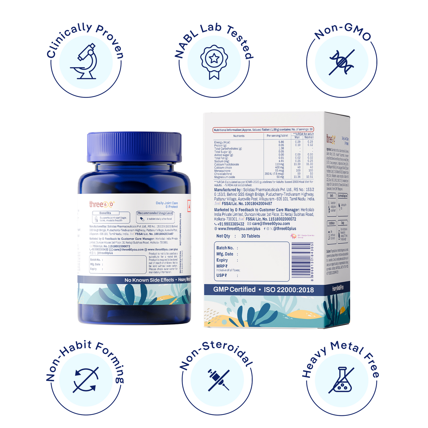 3sixty+ Daily Joint Care & Protect tablets contains UC-II, a clinically proven ingredient that enhances knee joint flexibility. Derived from chicken sternum cartilage, this product is non-vegetarian.