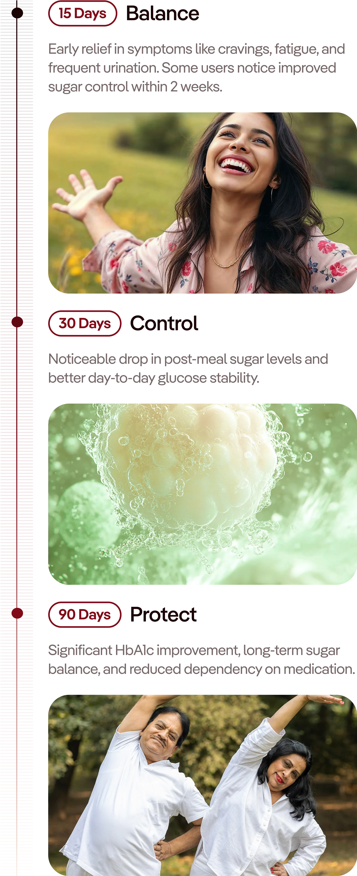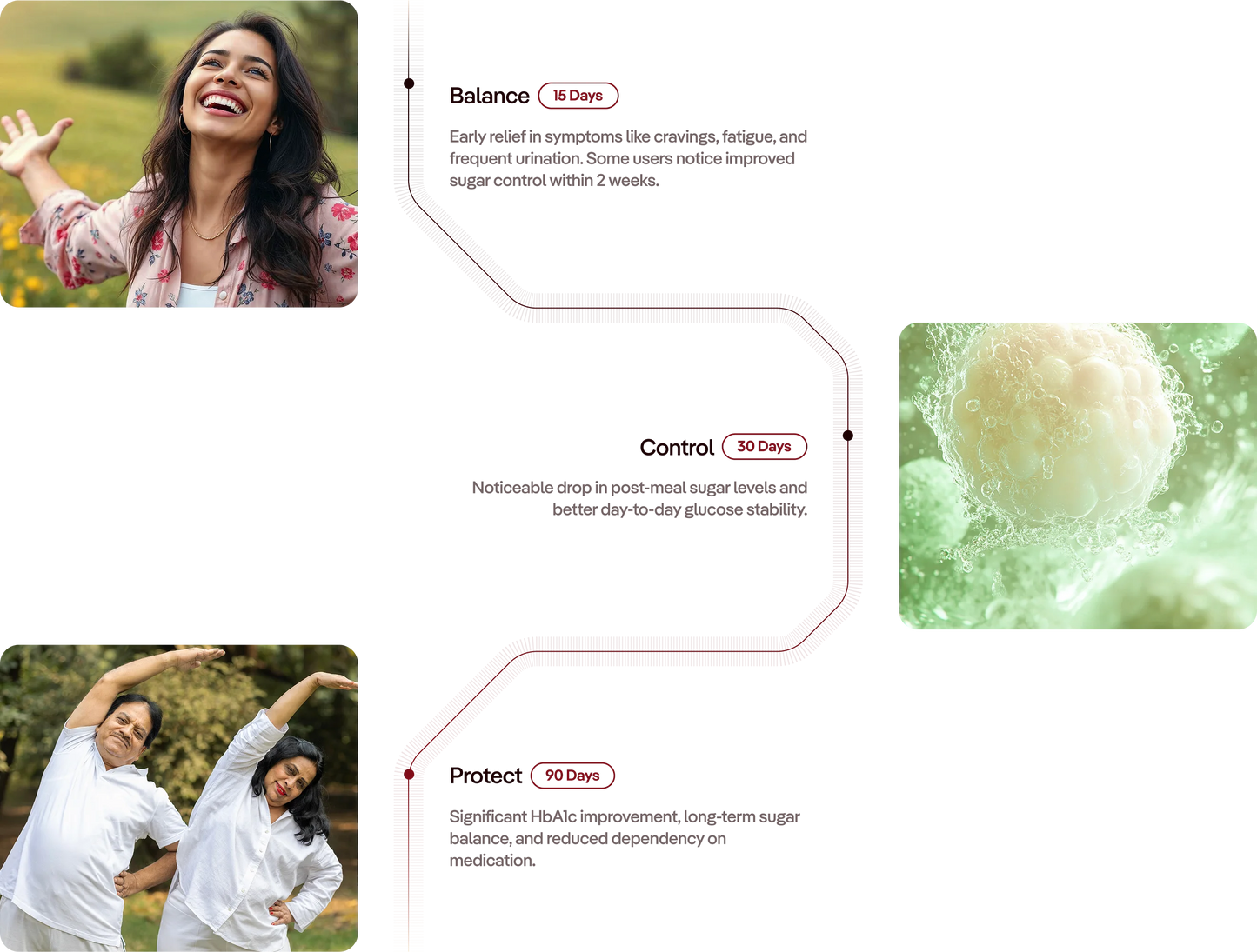 - Balance: Lowers post-meal sugar spikes within 30 minutes (with 30 days of usage) and helps keep glucose steady all day