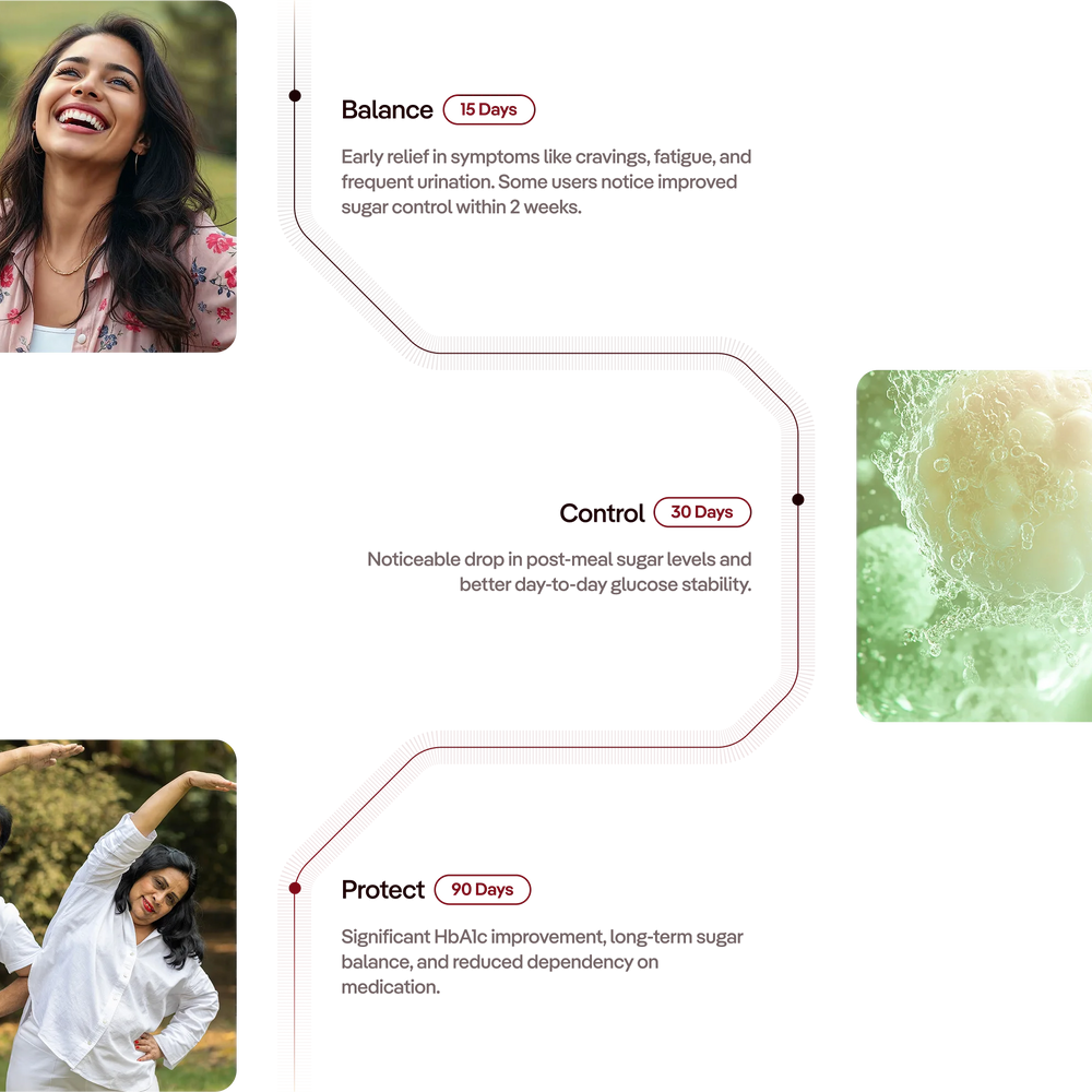 Some users notice relief in symptoms like cravings and fatigue within 2 weeks. Most see improved sugar control in 30 days, with HbA1c improvements visible in 90 days.
